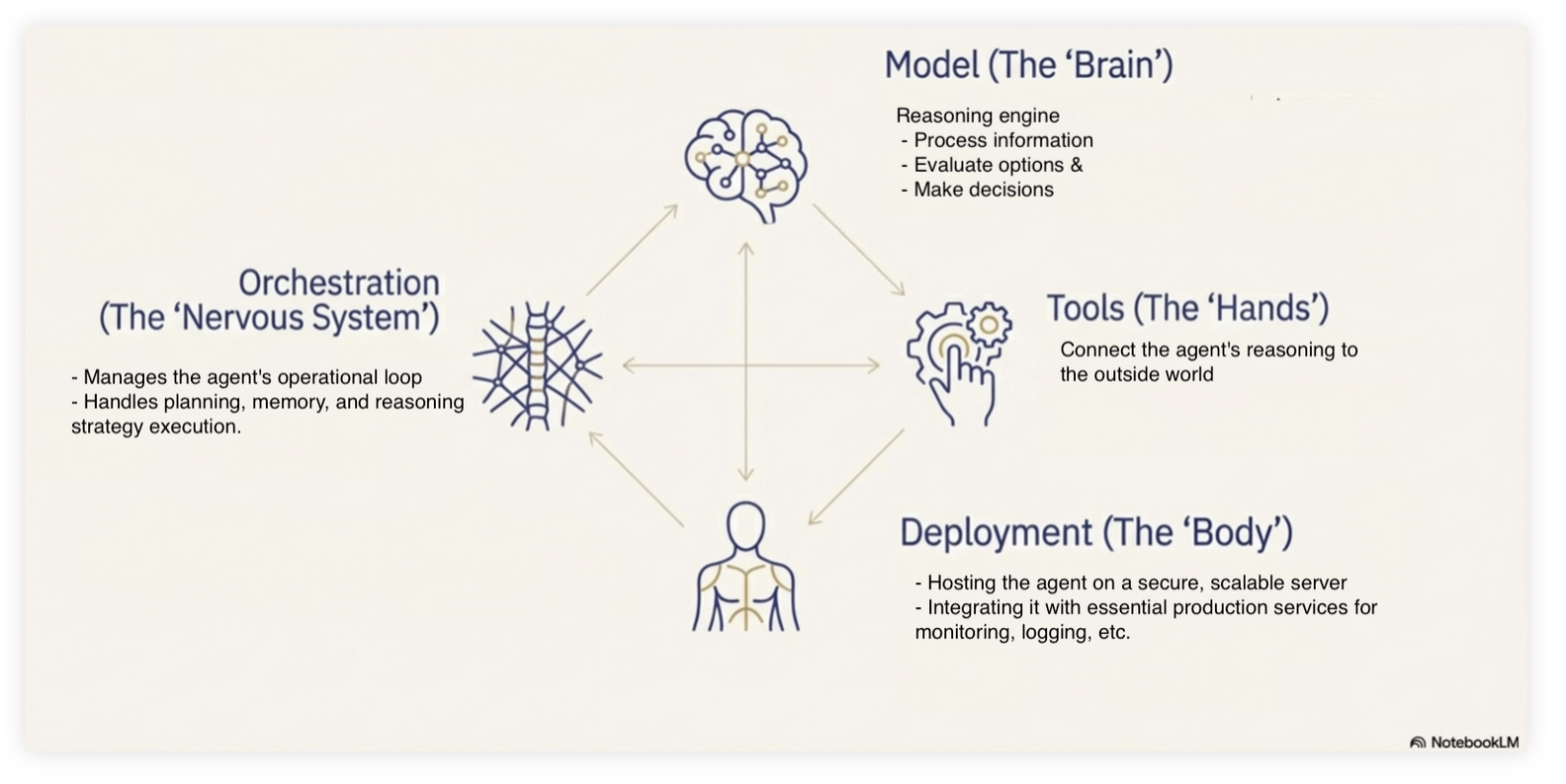Den viktigste komponenten som gjør agenten til en agent er verktøyene. Verktøyene er spesiallagede komponenter som gjør spesifikke handlinger (søke i en database, bestille en togbillett, gå gjennom møtedeltakernes kalendre, booke rom og sende ut møteinnkalling). Men i tillegg har en agent et mye mer avansert orkestreringsssystem enn det en vanlig chat tjeneste har. En vanlig chat tjeneste håndterer bare instruksjoner fra brukeren, og lever tilbake svar fra språkmodellen. En agent må håndtere instruksjoner fra en bruker, den må håndtere og hente ut informasjon om systemet den kjører på, kjenne til hvilke verktøy den kan bruke, håndtere resultater levert fra verktøyene, og ikke minst må den bestemme når og hvilke verktøy som skal brukes i en gitt kontekst.