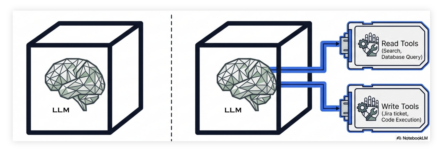 Forskjellen mellom en vanlig språkmodell (venstre) og en agentisk KI med tilgang til verktøy (høyre). En agent kan ta autonome beslutninger om å bruke verktøy for å aksessere eller endre ekstern data.